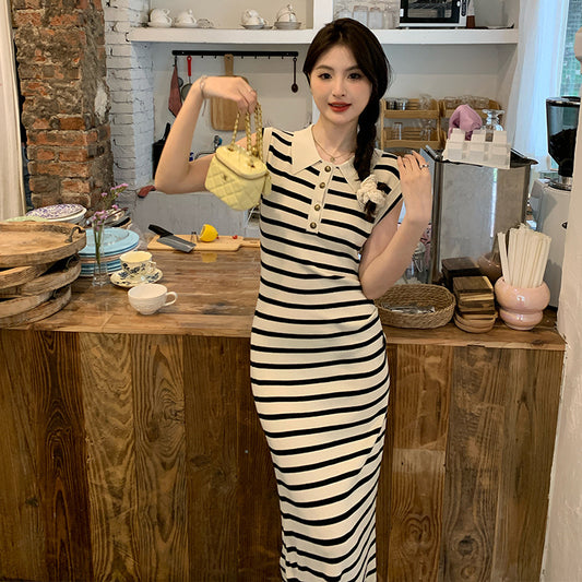 French Style High Sense Graceful Collar Striped Knitted Dress Women's 2025 Summer New Elegant Slimming Dress