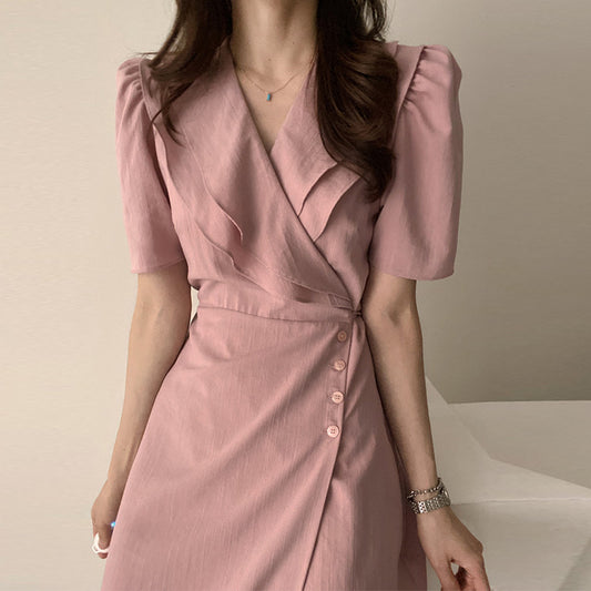 Pink puff sleeve dress women's summer sweet cinched slimming elegant tied French long dress