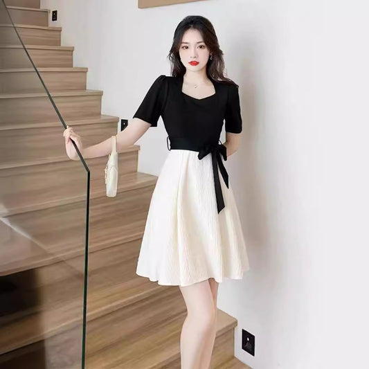 Popular French Hepburn Style Women's Fashion Design High Waist Slimming Square Collar Color Matching A- line Dress