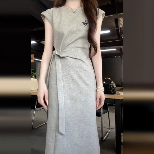 New French Style Gray Short Sleeve Dress for Women Summer Elegant High-end Casual Waist-cinching Long Dress
