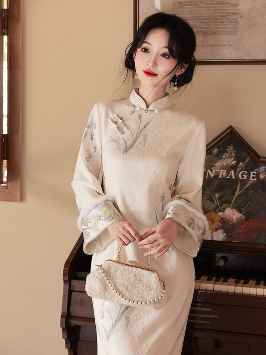 Lavender Floral Qipao for Autumn and Winter, High-End Slim-Fit Modified Elegant New Chinese Style, Suitable for Daily Wear.