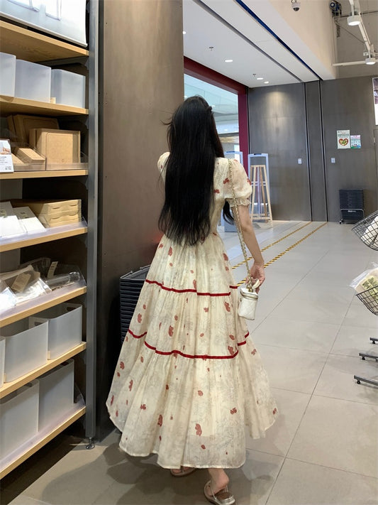 Pure Desire Style Slimming Stitching Floral Skirt Women's Summer Square Collar Bubble Sleeve A- line dress