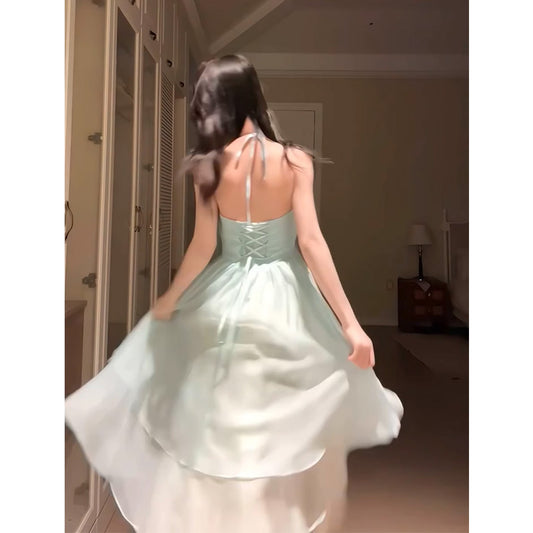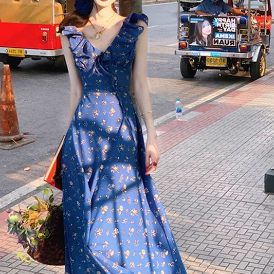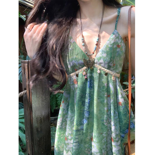 Sweet and Spicy Girl Floral Strap Dress Fairy Summer Dress Beach Vacation Backless Sexy Elegant Waist-Cinching Long Dress
