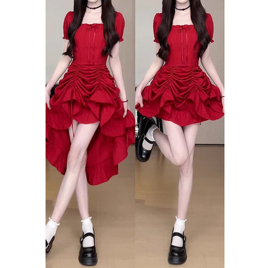 One Dress Wear More Red Cake Dress Early Summer Birthday Ancient Military Uniform French Short Sleeve Dress Waist Dress Square Collar Pleating