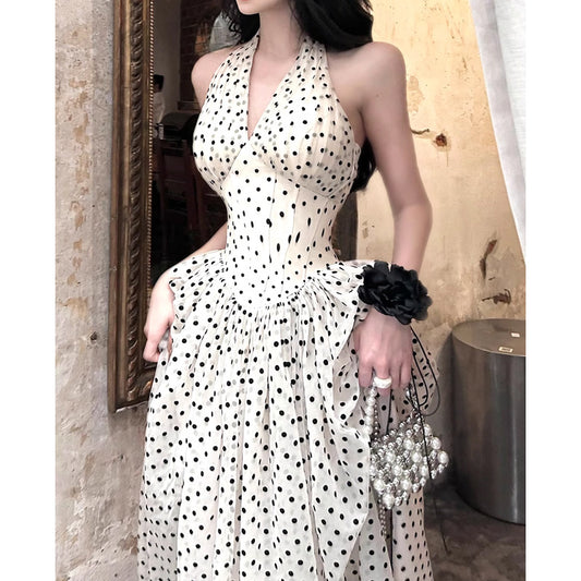 Polka Dot Halter Neck Dress for Women New Fishbone V-neck Long Dress Elegant Waist-cinching Gentle Style Trend