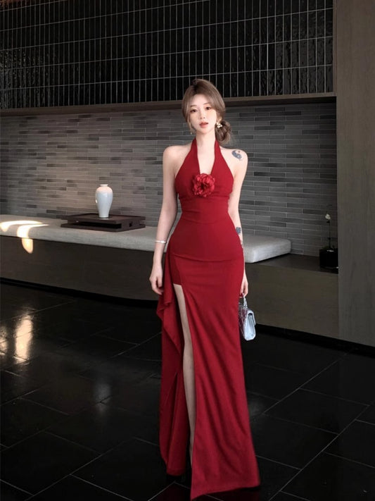 Red Three-Dimensional Flower Halter Neck Dress for Women, Summer Slim Fit Long Dress, Pure Desire Waist-Cinching Slit Bodycon Dress