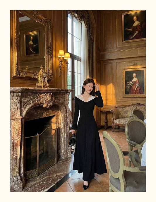 Lace patchwork dress for women, new autumn and winter style, waist-cinching, slimming, vintage design long dress