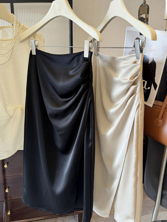Elegant Goddess Style~Asymmetric Smooth Satin Skirt, Spring and Summer Pleated Pencil Skirt, Mid-Length Straight Skirt