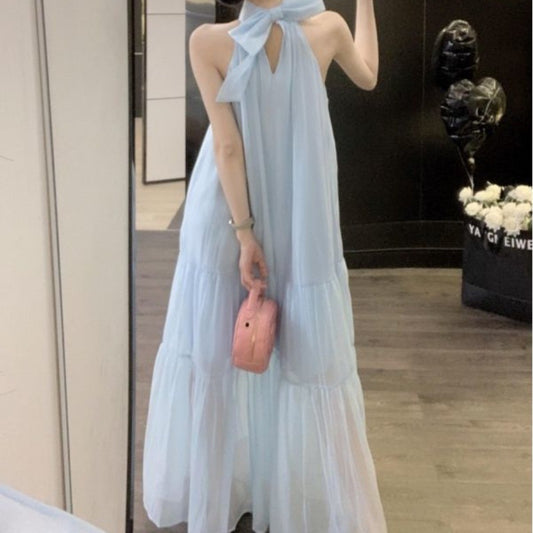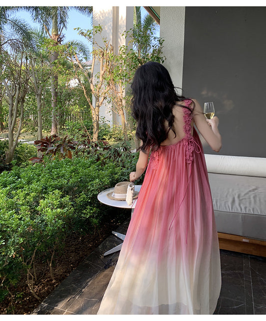 Beach Dress Sanya Vacation Strap Long Dress Pink Gradient Chiffon Dress Super Fairy