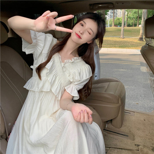 Apricot Super Fairy Halter Off-the-Shoulder Dress Women's Long Sleeve Spring New French Vacation Style Princess Dress Pettiskirt