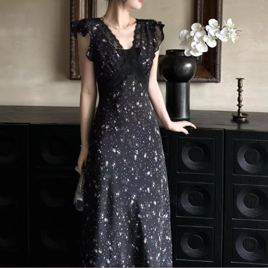 Black Lace Patchwork Floral Dress Vacation Style French Elegant Unique Beautiful Waist-Cinching Long Dress