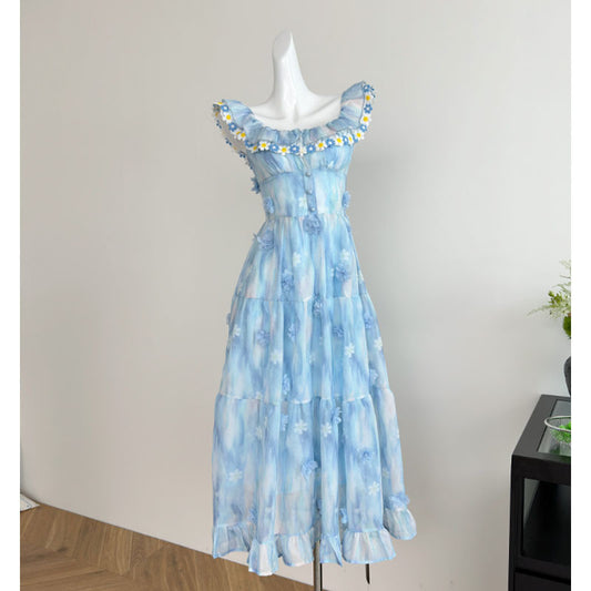 Blue Long Chiffon Printed Dress with Flutter Sleeves, French Sweet Style, Slimming Dress