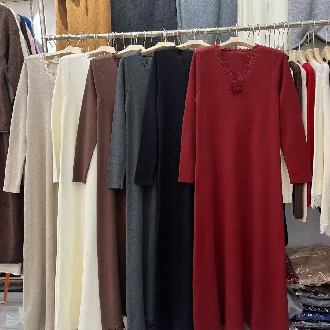 Autumn Winter New Gentle Waist Slimming Inner Wear Over-the-Knee Long Skirt Lace Edge Floral Knitted Dress for Women